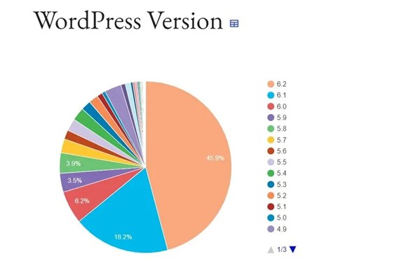 Na wykresie kołowym powyżej widzimy udział konkretnych wersji wordpressa na rynku w 2023 roku. Wynika z tego, że mniej niż połowa instalacji wordpress jest regularnie aktualizowana. To właśnie brak aktualizacji jest jednym z głównych zagrożeń. Tak jak wspomniałem w poprzednim punkcie, podstawową metodą zabezpieczenia swojej strony jest regularna aktualizacja wordpressa do najnowszej wersji.